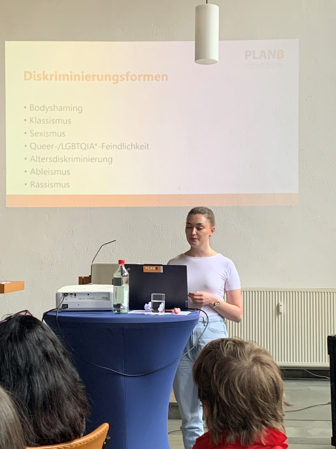 „Diskriminierung erkennen und benennen“ lautete der Titel des Vortrags von Shkurte Sadiku aus der Servicestelle gegen Diskriminierung in Herne. Sie thematisierte darin besonders die Merkmale unterschiedlicher Diskriminierungsformen. Im Anschluss stellten Ismeta und Elvira die neue Meldestelle DINA NRW vor. Die Dokumentations- und Informationsstelle Antiziganismus/Antiromaismus, eine von vier spezialisierten Meldestellen in NRW, hat die Aufgabe, Diskriminierungsstrukturen gegenüber Sinti:zze und Rom:nja sichtbar zu machen. Die Teilnehmer:innen bekamen einen Einblick, wie die Arbeit der Meldestelle gestaltet ist und wie die Meldung von Vorfällen abläuft. Alle Teilnehmer:innen der Fachbereichskonferenz wurden dazu aufgerufen, die Informationen über DINA zu verbreiten und in Beratungssituationen darauf aufmerksam zu machen. Auch die anderen drei NRW-Meldestellen wurden vorgestellt.