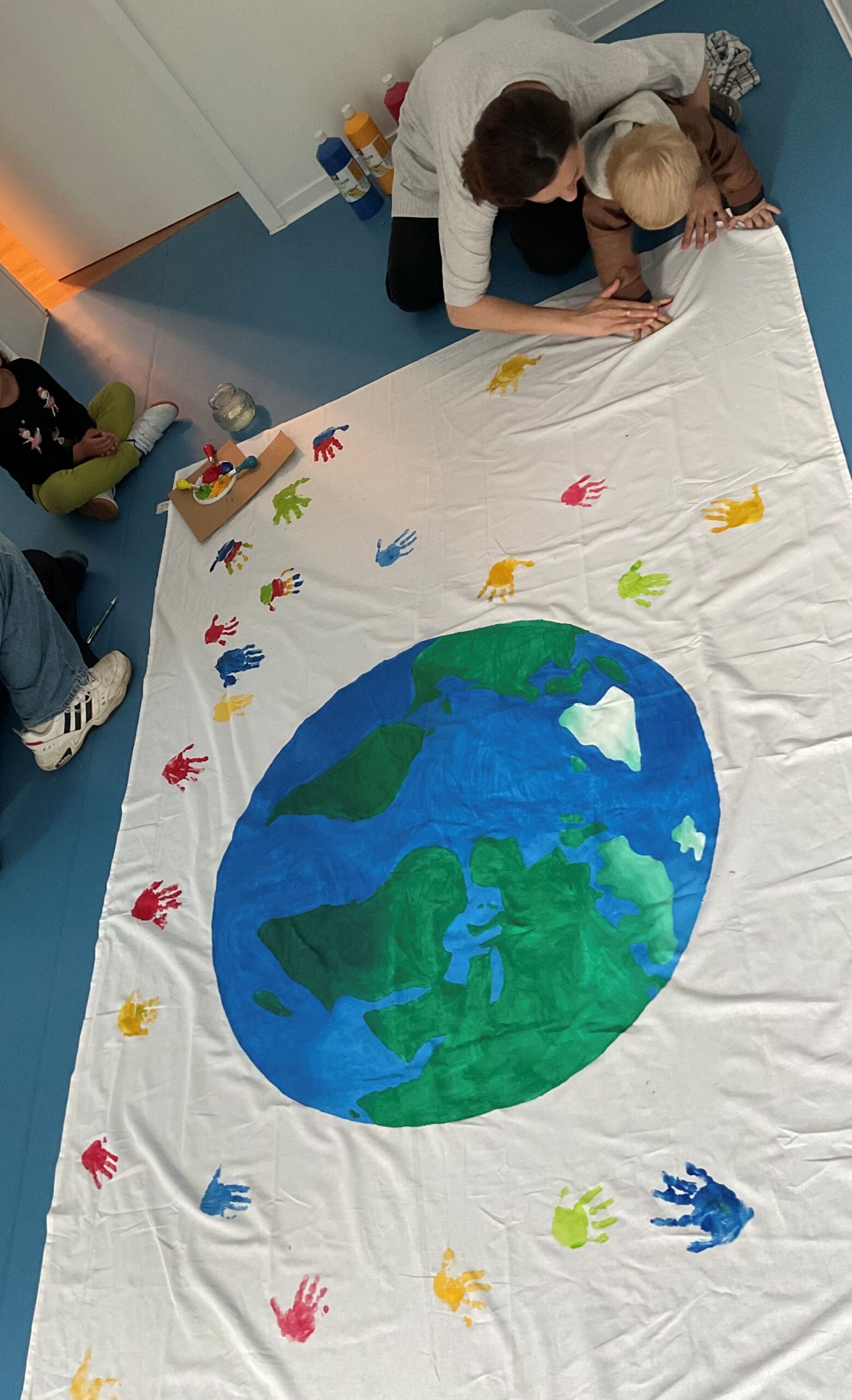 Im Vorfeld durfte sich jede Gruppe ein Wunschessen aussuchen. Jeden Morgen trafen sich alle Kinder im Bewegungsraum und sangen gemeinsam das Lied „Wir sind Kinder einer Welt“. Dieses Lied begleitet alle durch die ganze Woche und von Mal zu Mal sangen die Kinder das Lied mit immer mehr Freude und Engagement. In der Ruhephase wurden Bücher zum Thema Kinderrechte vorgelesen und in den Gruppen thematisiert. Jedes Kind durfte seinen Handabdruck auf einem Tuch mit einer großen Weltkugel hinterlassen, denn jedes Kind ist einzigartig und wichtig. Im Eingangsbereich der Kita präsentierten wir das Thema Kinderrechte anschaulich für die Eltern. Sie konnten anonym einen Wunsch für Ihre Kinder auf einer Karte hinterlassen: „Was wünsche ich meinem Kind für ein glückliches Leben?“