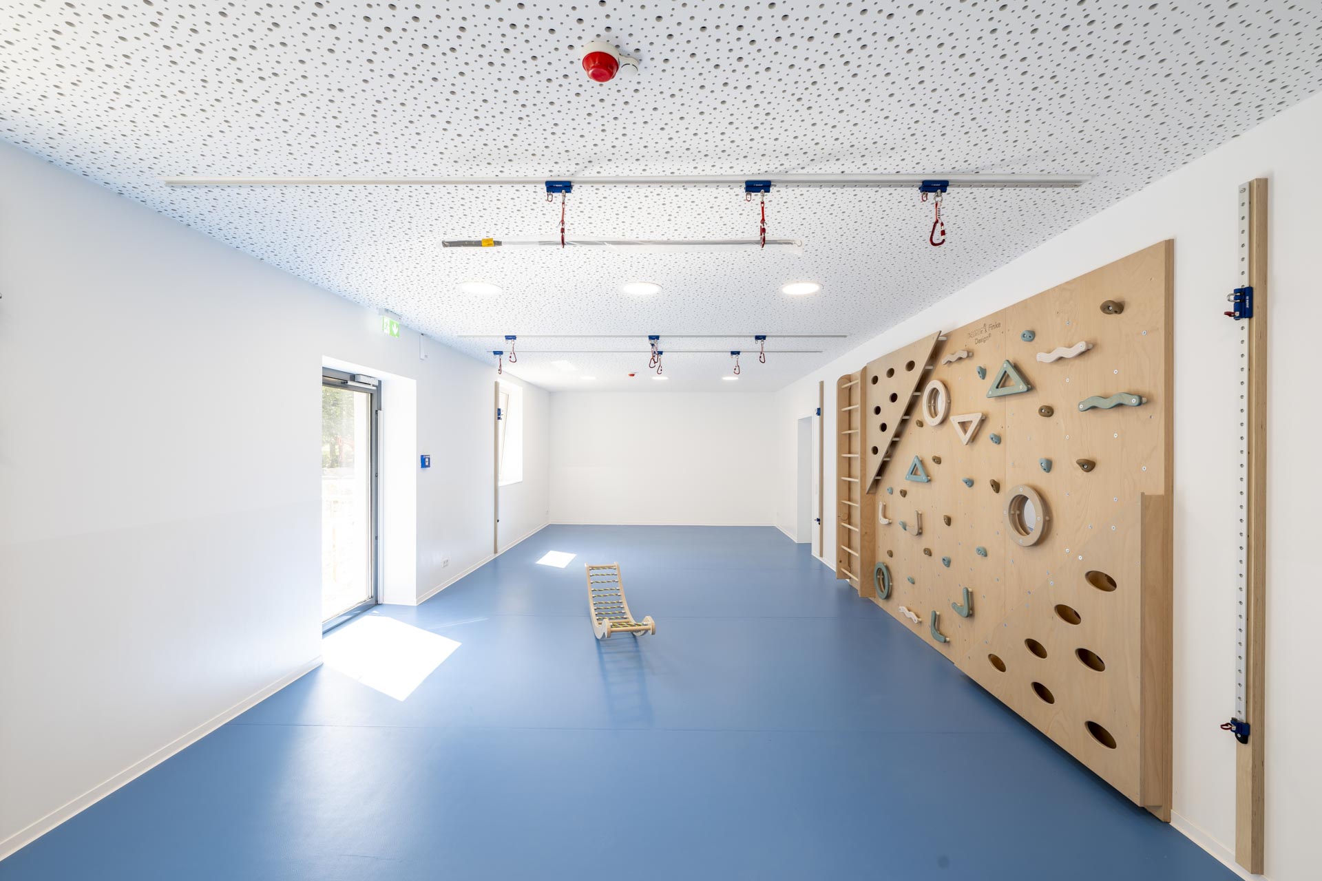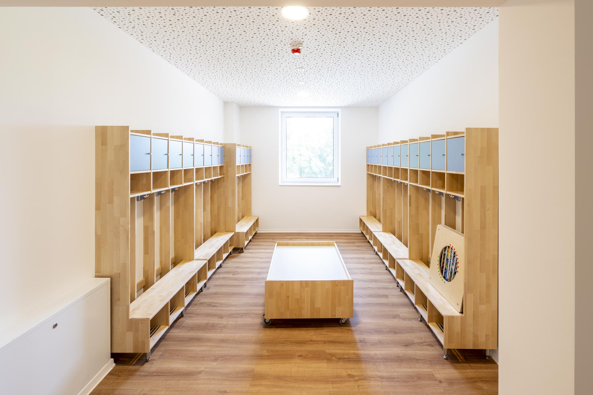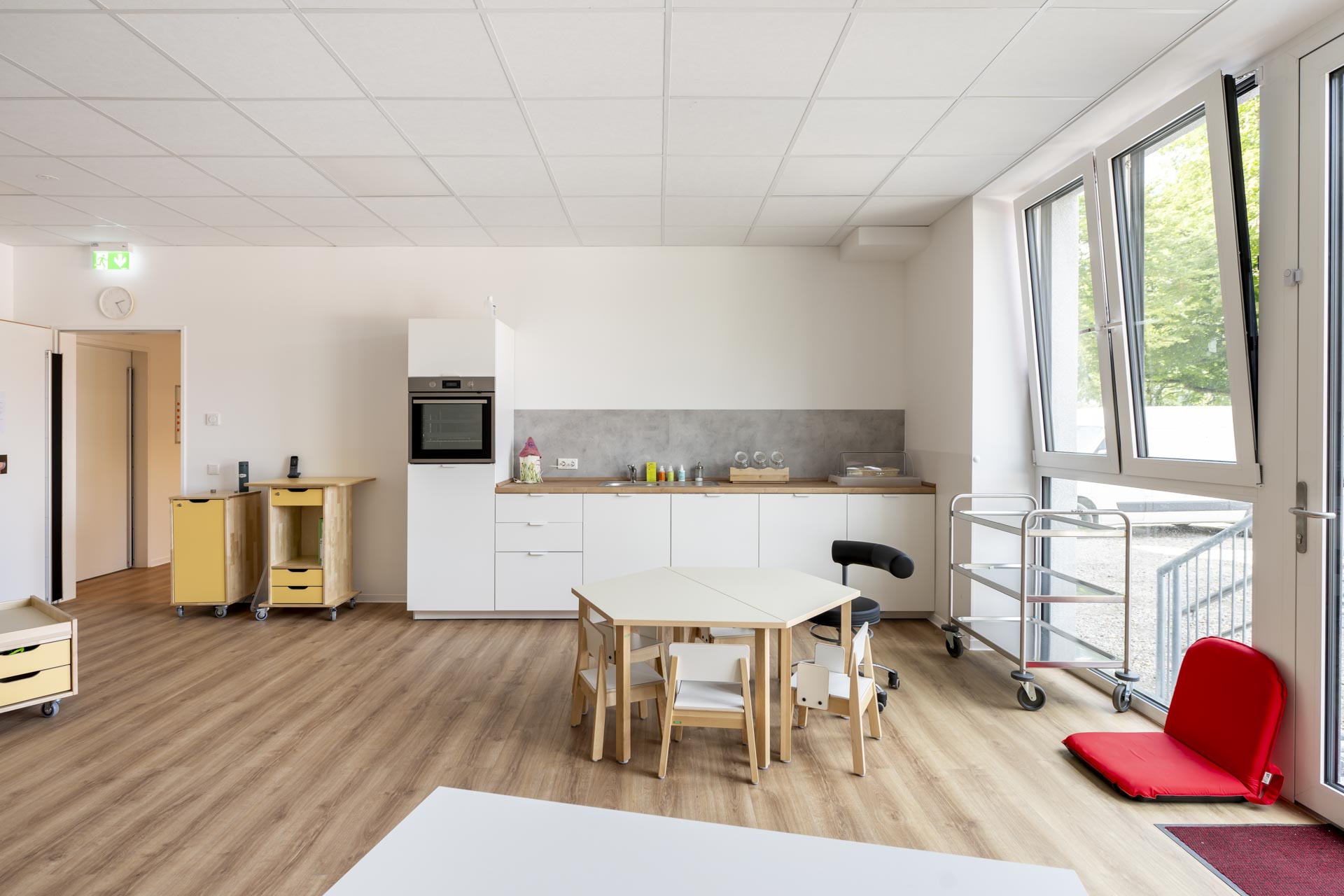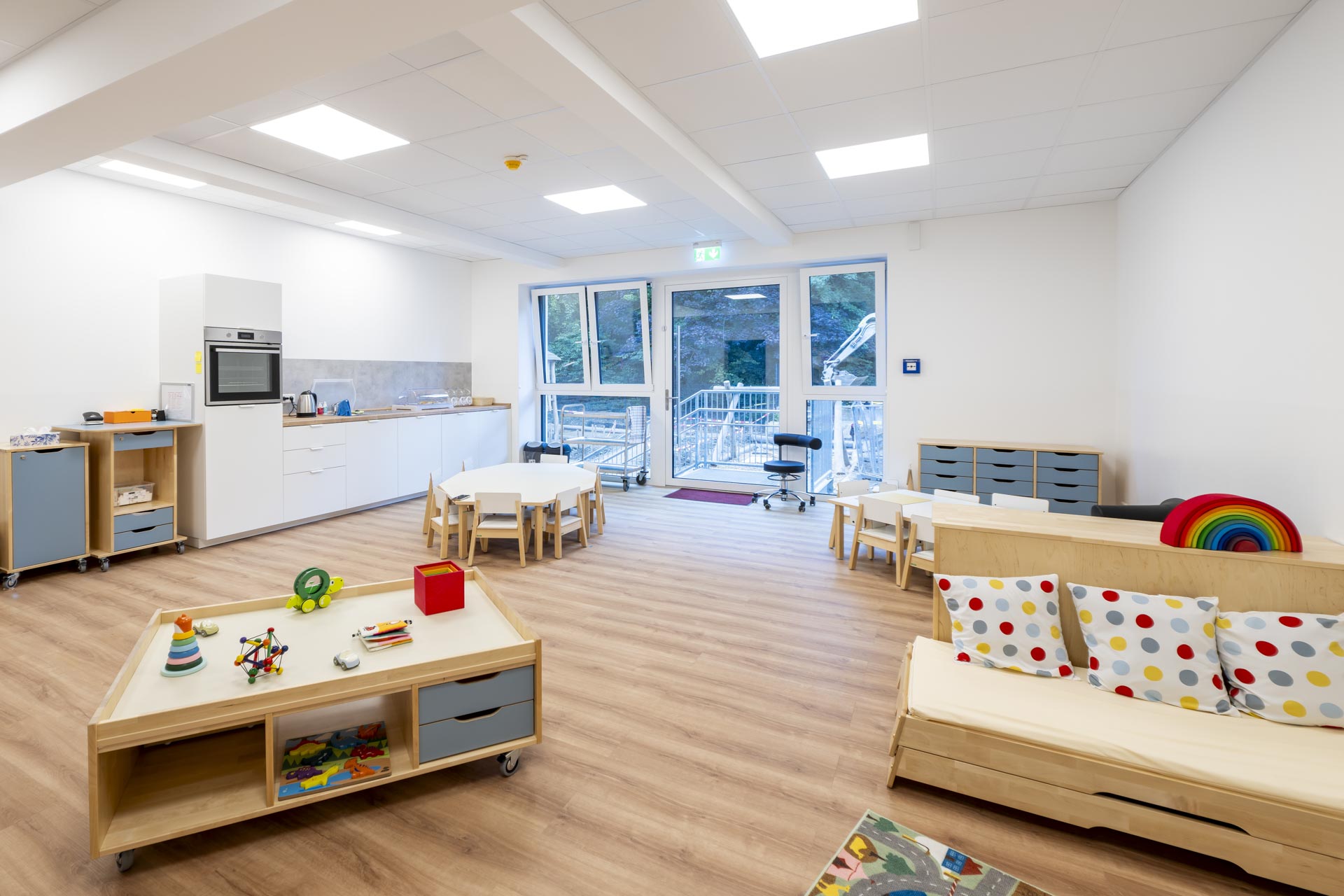 Die Gruppenräume verfügen über bodentiefe Fenster, die den Blick in die Natur freigeben oder es den Eltern ermöglichen, ihre Kinder zu verabschieden. Beim Betreten des Hauses gelangen Sie in ein offenes, lichtdurchflutetes Treppenhaus. Im Erdgeschoss befinden sich neben den zwei Gruppenräumen auch zwei Schlafräume und ein Differenzierungsbereich mit verschiedenen Themenschwerpunkten wie zum Beispiel Bauen und Konstruieren. Zudem finden Sie dort das Leitungsbüro sowie einen Mehrzweckraum mit einer ausgebauten Bewegungslandschaft.