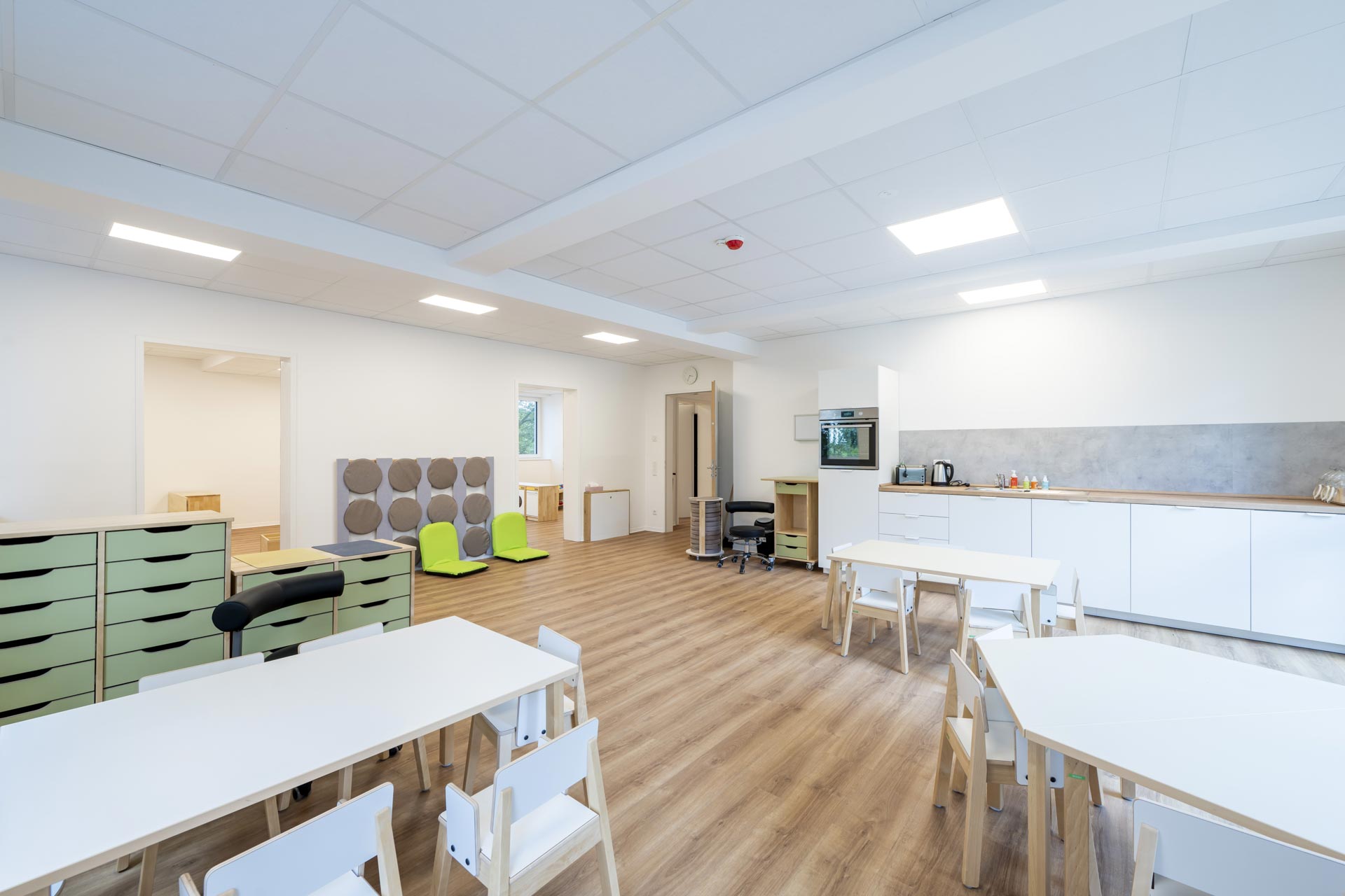 Im oberen Stockwerk befinden sich zwei weitere Gruppenräume, Schlafräume und Differenzierungsräume mit verschiedenen Themenschwerpunkten. Des Weiteren beherbergt das erste Obergeschoss eine Küche, in der täglich frisch gekocht wird, einen Personalraum sowie einen Therapieraum, der für eventuelle therapeutische Maßnahmen während der KiTa-Zeit genutzt werden kann.